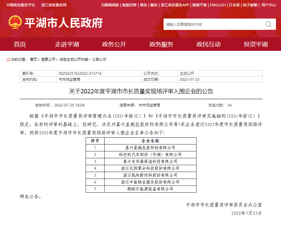 近期,平湖市人民政府官网发布公告,由平湖市市长质量奖评审委员会办公室根据《平湖市市长质量奖评审管理办法(2021年修订)》和《平湖市市长质量奖评审实施细则(2021年修订)》规定,在材料评审的基础上,研究决定,对威廉希尔williamhill能源装备有限公司等7家企业入围2022年度市长质量奖现场评审。